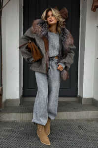 Самая популярная модель зимнего пуховика от фирмы Tannossto. Серый цвет, комбинированная ткань, высокий воротник стойка с песцом, теплый наполнитель пух перо, фасон оверсайз.